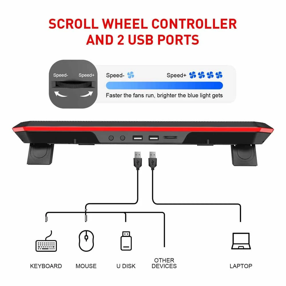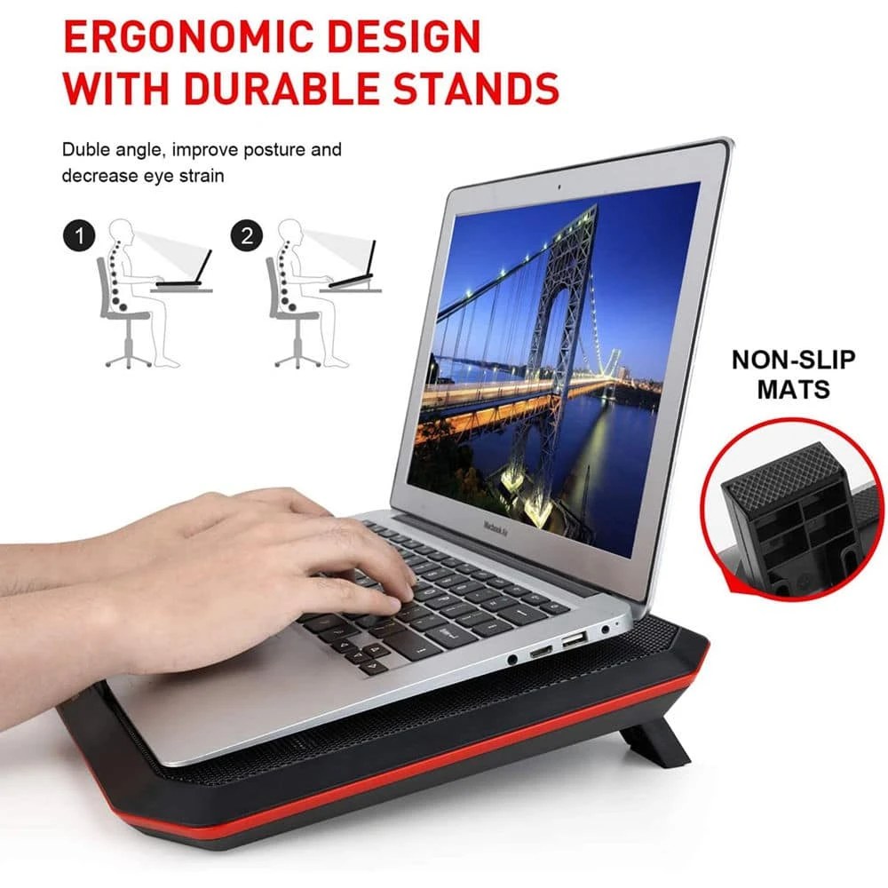 Laptop cooler stand is with two foldable legs for height settings, allow you to the perfect angle when working or gaming; Builted with non-slip baffle, effectively prevent laptop slipping off.