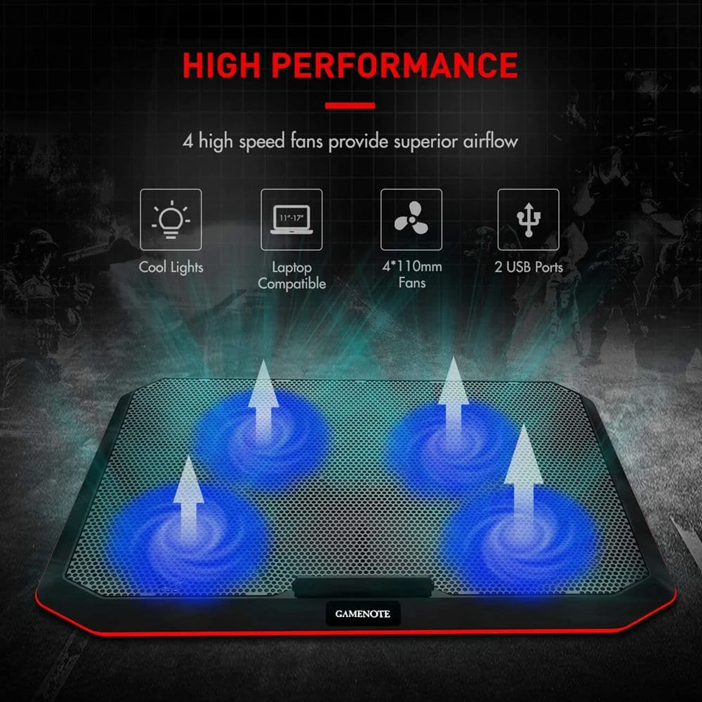 The laptop cooling pad is with 4 large fans, combine with high-quality metal mesh panel, draws heat away from laptop effectively. Suitable for 15.6″- 17.3″ laptops.