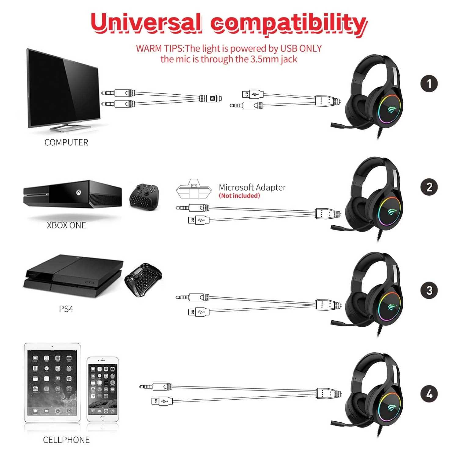 HAVIT H2232D RGB Gaming Headset is widely compatible with PS4, PS4 pro, XBOX , XBOX One, Nintendo switch, desktop PC/ computer, laptop, tablets, mobile. Plug and play, no driver needed. Easy to use.