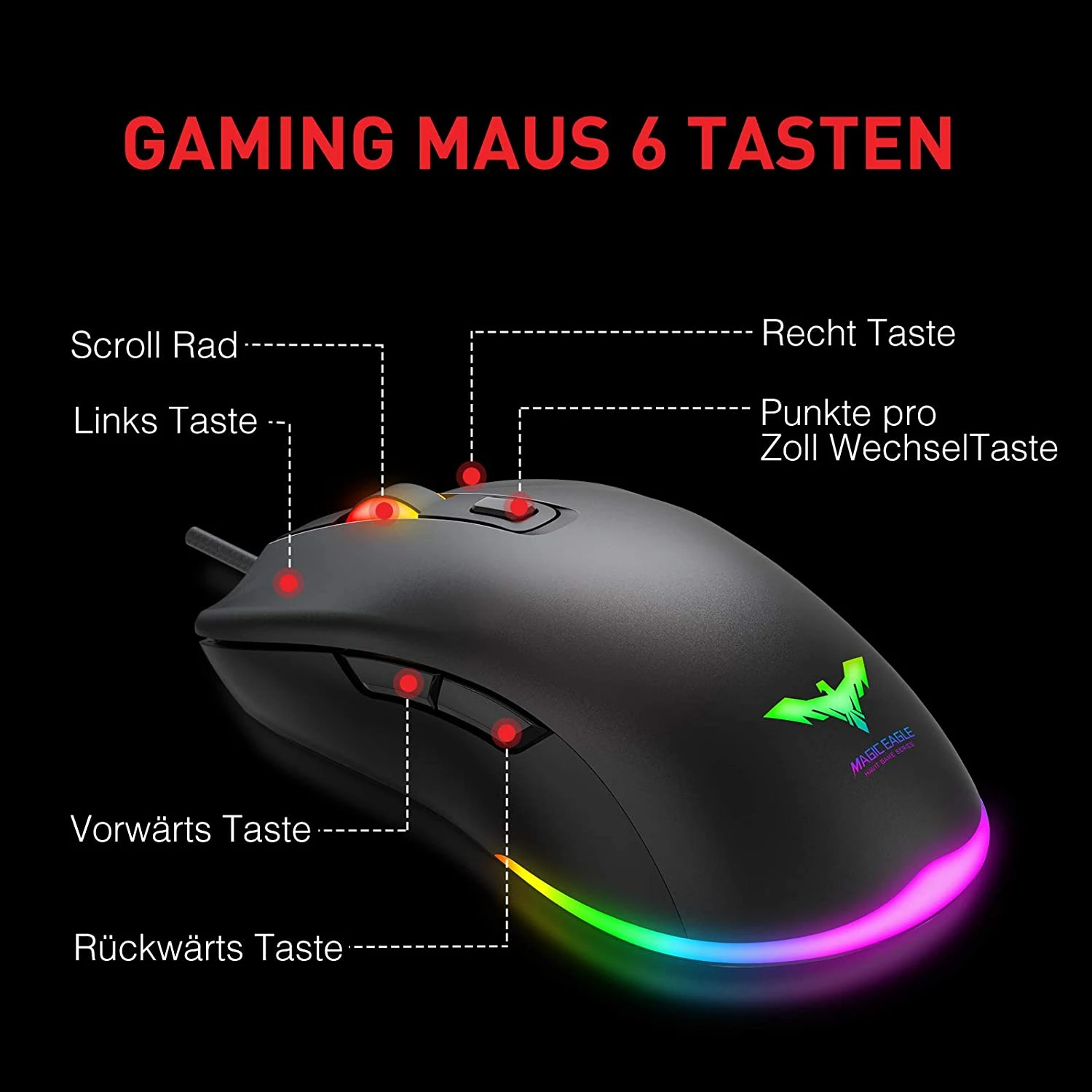 - 4 color breathing light of mouse: Red, Blue, Purple, Pink; Light-off mode: forward/back button +DPI