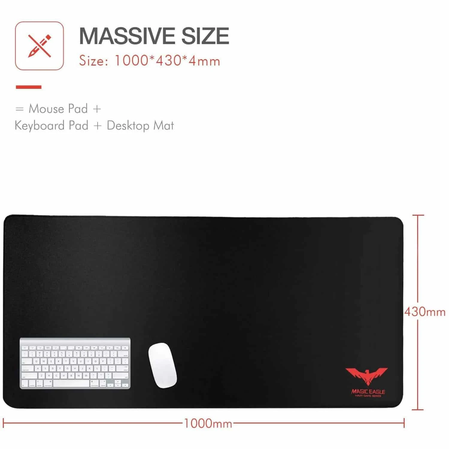 The HAVIT MP857 Large Mouse Pad / Mat comes with a dimension of 1000 * 430 * 4 mm(39.37 *17.00 * 0.16”), provides larger usable area to cover keyboard, mouse and other stuff on the desktop, with plenty of space left over allow better mouse movement. The pad is huge enough to cover the desk top area, and it also can be your desk mat.